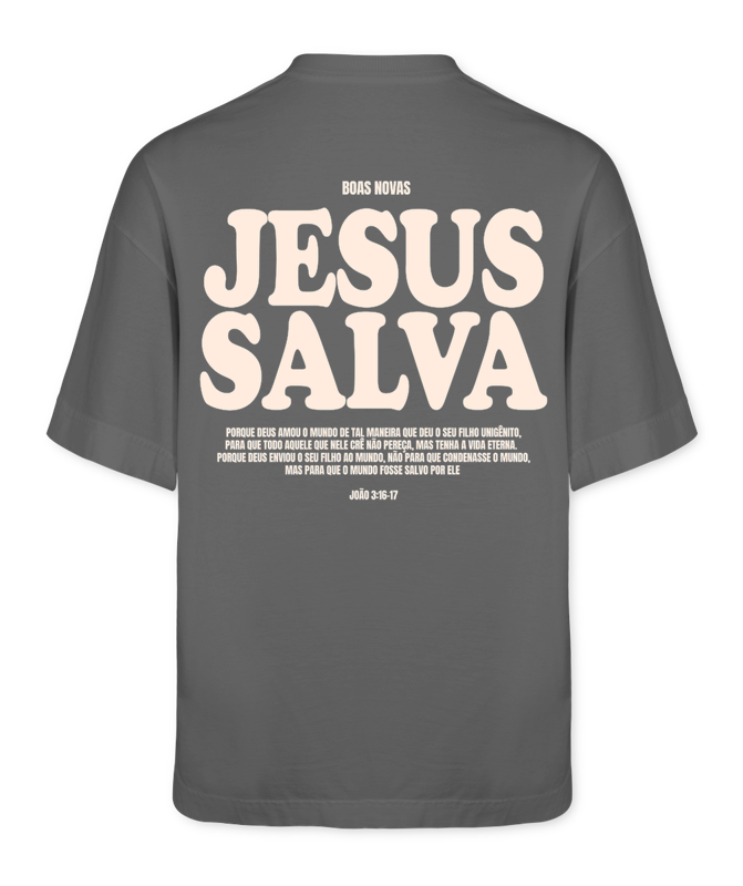 Mais do que uma peƧa de roupa, um manifesto. A frente minimalista com a frase "JESUS SALVA" prepara o caminho para a mensagem completa nas costas: o texto bĆblico de JoĆ£o 3:16-17. Ć a essĆŖncia do cristianismo traduzida para o streetwear.